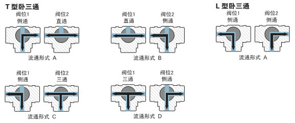 T型閥芯孔道可使三條正交的管道互相連通或切換,起分流或合流作用;L型孔道連接相互正交的兩管道。使另一條孔道切斷,起改變介質(zhì)流向作用。